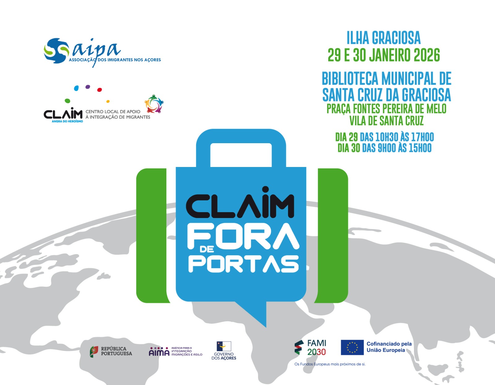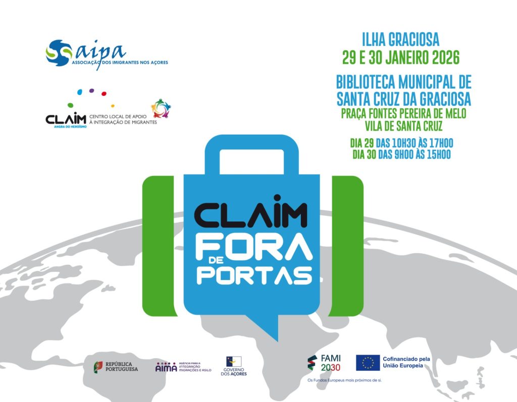 No âmbito da iniciativa CLAIM FORA DE PORTAS, que consiste na deslocação das técnicas da AIPA às seis ilhas onde não existe o nosso Gabinete de Apoio aos Imigrantes (Santa Maria, Faial, São Jorge, Graciosa, Flores e Corvo), informamos os cidadãos imigrantes de que estaremos na ilha Graciosa nos próximos dias 29 e 30 de Janeiro para realizar atendimentos presenciais.